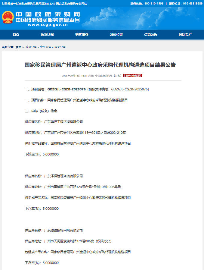 選自網(wǎng)址:國家移民管理局廣州遣返中心政府采購代理機(jī)構(gòu)遴選項(xiàng)目結(jié)果公告 http://www.ccgp.gov.cn/cggg/zygg/cjgg/202509/t20250916_25357482.htm